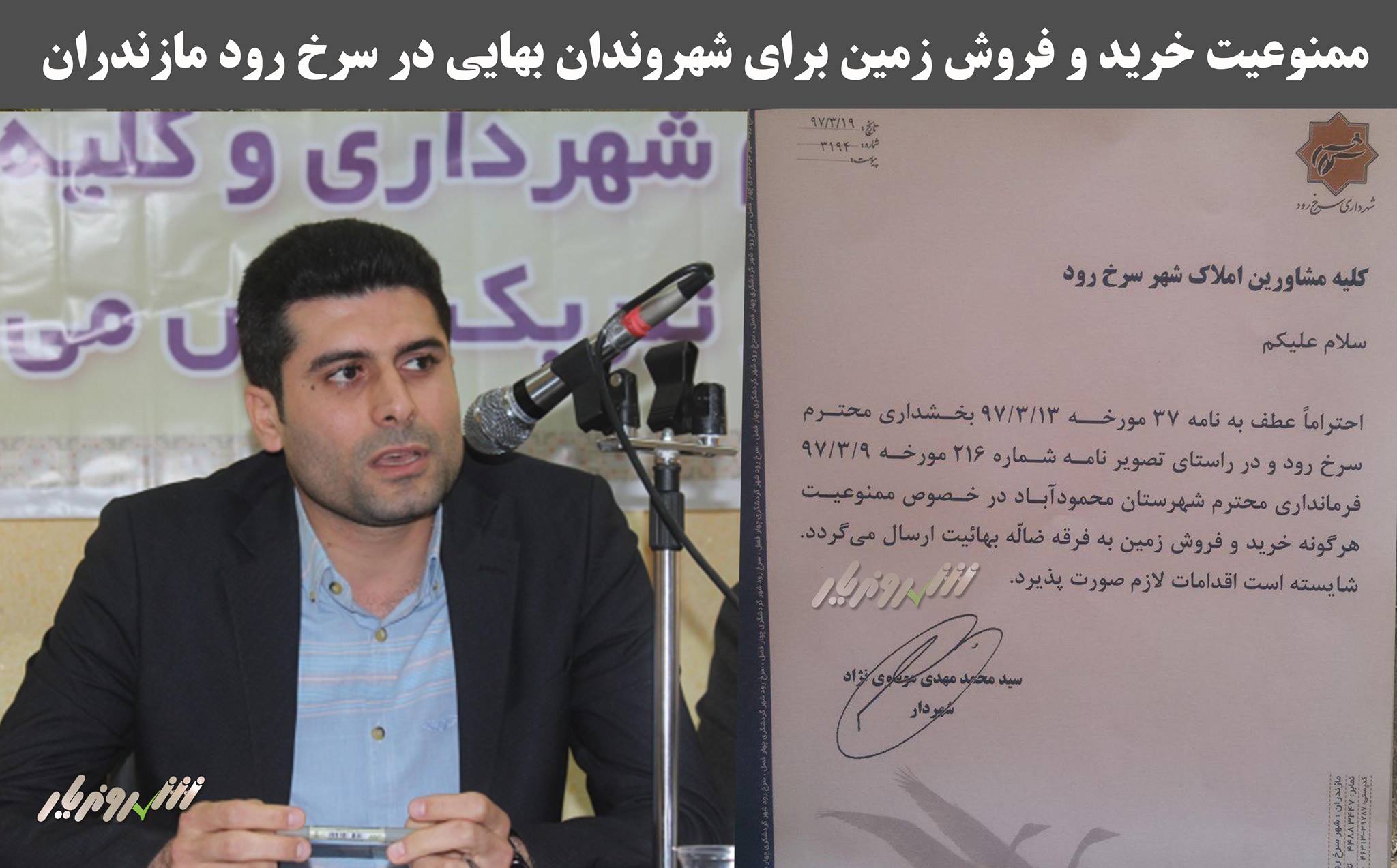 “احتراما عطف به نامه ۳۷ مورخع ۱۳ خرداد ۱۳۹۷ بخشداری محترم سرخ رود و در راستای تصویر نامه شماره ۲۱۶ مورخه ۹ خرداد ۱۳۹۷ فرمانداری محترم شهرستان محمودآباد در خصوص ممنوعیت هرگونه خرید و فروش زمین به فرقه ضاله بهائیت ارسال می گردد. شایسته است اقدام لازم صورت پذیرد.